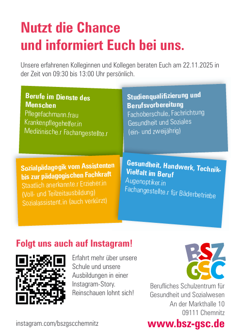 Am 22.11.2025 begrüßen wir herzlich alle Interessierten zu unserem Tag der offenen Tür. Dieser findet im Anschluss an unsere Projektwoche statt. Daher könnt ihr Einblick nehmen, womit sich die Schüler in Kleingruppen beschäftigt haben. Außerdem finden in regelmäßigen Abständen Infoveranstaltungen zu den einzelnen Ausbildungsrichtungen (Fachoberschule, Sozialassistent, Erzieher) statt. Dazwischen werden euch Auszubildende unser Schulhaus zeigen oder ihr könnt euch im Schulhof mit kleinen Snacks stärken und mit unseren Auszubildenden ins Gespräch kommen.