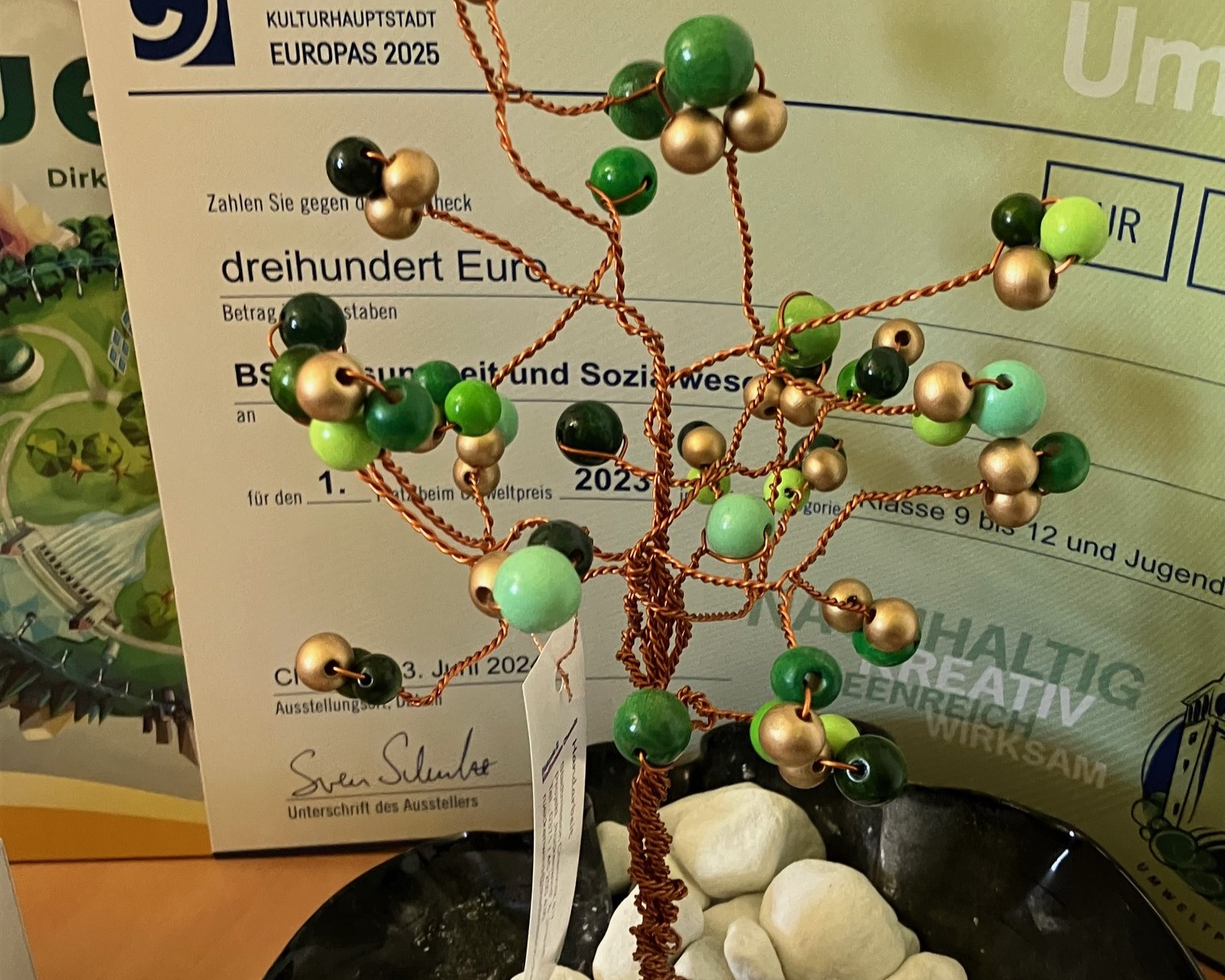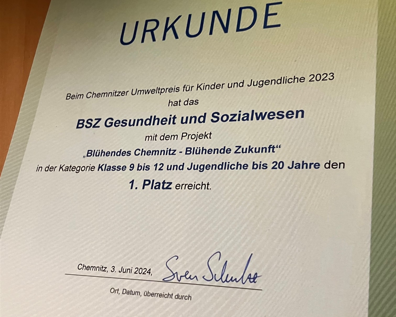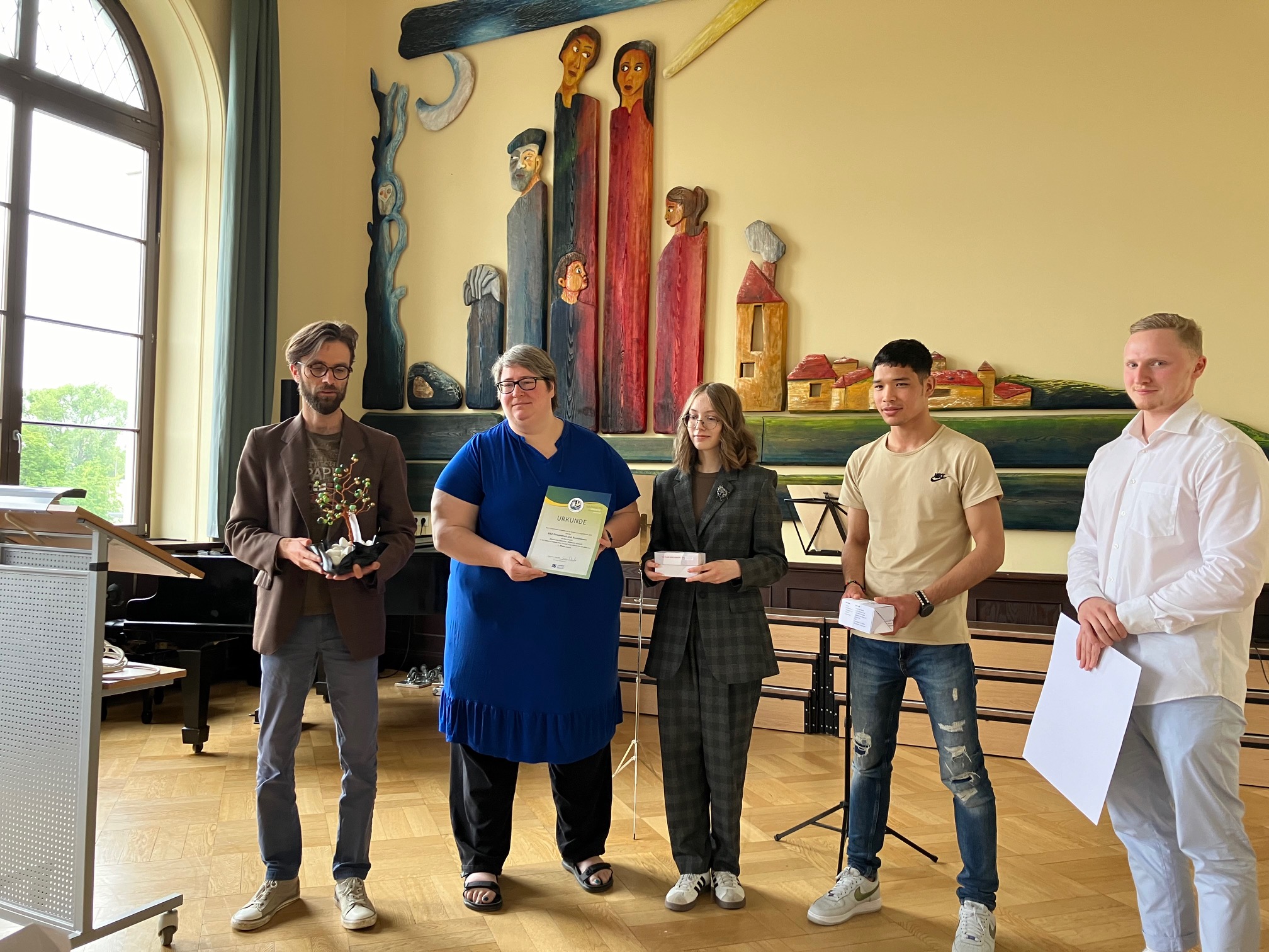 Im Rahmen der Zeugnisausgabe am 14.06.24 verliehen Herr Meyer (Schulamtsleiter) sowie Herr Jehmlich (Umweltamt) den 1. Preis an die Schülerinnen und Schüler unserer Vorbereitungsklasse und unseres Berufsvorbereitungsjahres.