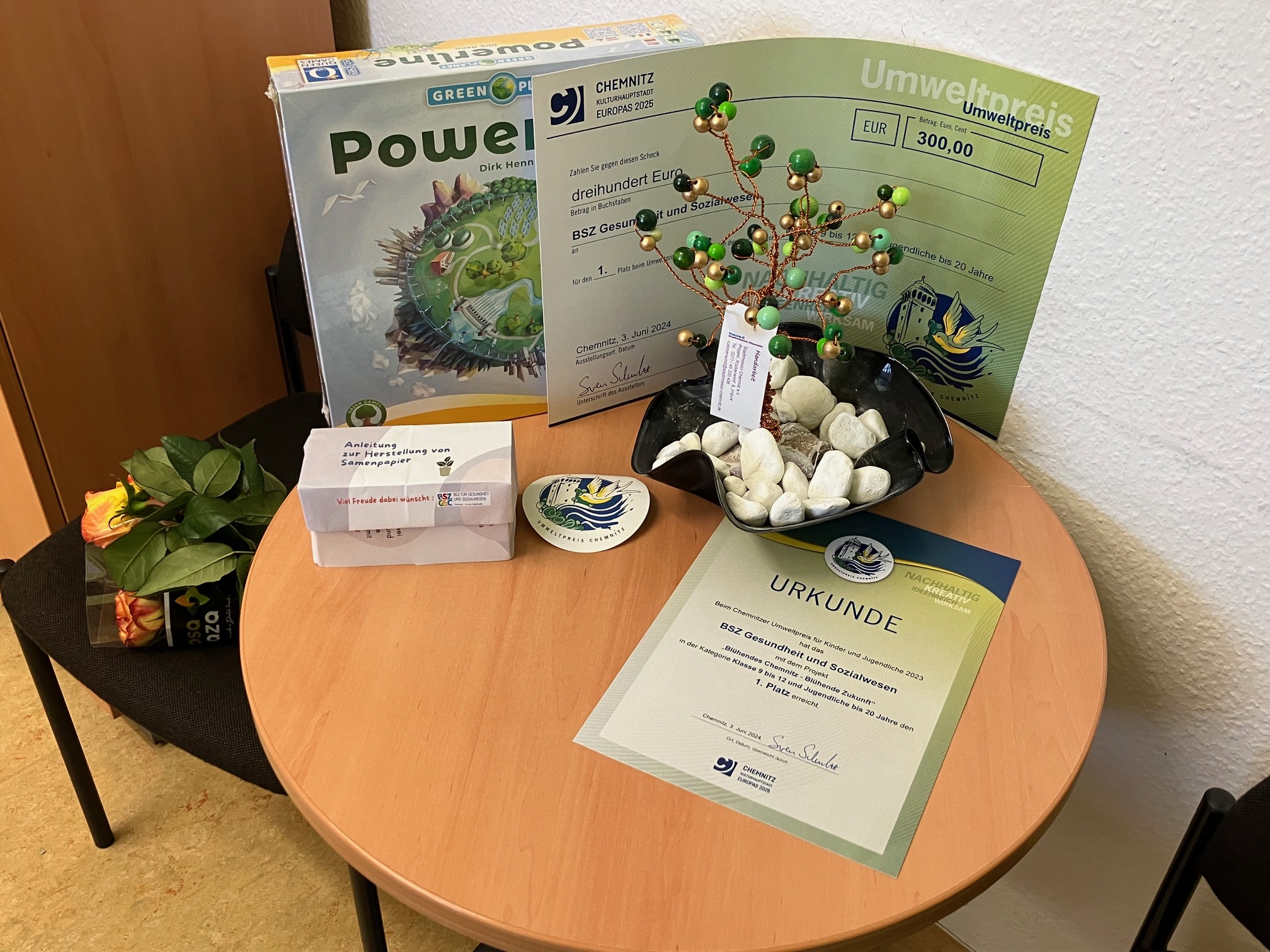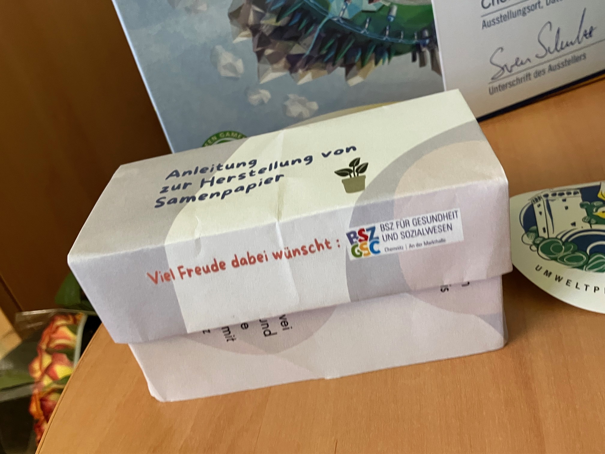 Zusammen mit ihren Lehrerinnen Frau Mühlbach und Frau Obermeit stellten sie selbst Samenpapier her und entwickelten Boxen mit einer Anleitung zum Nachahmen. Diese Idee wurde mit dem 1. Preis in der Kategorie "Klasse 9 bis 12 und Jugendliche bis 20 Jahre" prämiert. Wir verschenken diese Boxen an die Schüler der Oberschulen und Gymnasien, die uns zur Berufsorientierung besuchen. So können auch deren Schulen noch ein bisschen aufblühen. Wir danken allen Schülern der beiden Klassen sowie unseren Kolleginnen für Ihr Engagement!